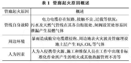 在綜合管廊運維階段,火災是有可能發(fā)生的災害事故,而管廊起火是由管線本身、周圍環(huán)境和人為狀況三大因素所引起的。管廊起火三大影響因素概述如表 1 所示。