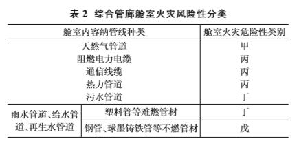 根據(jù) 《城市綜合管廊工程技術規(guī)范》(GB508382015),綜合管廊艙室火災危險性分類如表2所示:天然氣管道艙室的火災危險性類別為較高級;阻燃電力電纜、通信電纜、 熱力管道的火災危險性類別均為丙級;污水管道、塑料管等難燃管材的火災危險性類別均為丁級;鋼管、球墨鑄鐵管等不燃管材的火災危險性類別為戊級。