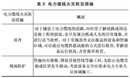 ⑥電力纜線在施工時采用明火引起的火災。通過對綜合管廊電力纜線火災危險性的分析,需要對電力纜線做好維護與管理工作,防范電力電纜火災的發(fā)生,防范措施如表3所示。