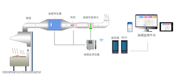 對油煙排污數(shù)據(jù)的監(jiān)測,包括油煙排放濃度,顆粒物,NmHc等數(shù)值采集監(jiān)測;同時對監(jiān)控風(fēng)機和凈化器的啟停狀態(tài)、運行數(shù)據(jù)進行監(jiān)測。