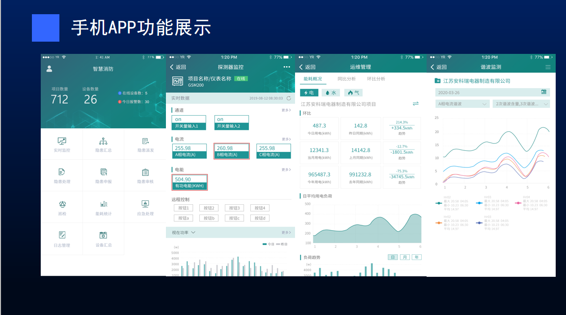 手機APP軟件具有IOS版本和安卓版本,并與電腦終端系統(tǒng)的數(shù)據(jù)同步,能展示剩余電流、溫度、電壓、電流等電氣安全參數(shù)的實時監(jiān)測數(shù)據(jù)及變化曲線、歷史數(shù)據(jù)與變化曲線;短路、斷線、漏電、超溫、過壓、欠壓、過流等電氣故障實時報警數(shù)據(jù)等;能實時顯示項目地理位置、未排除隱患數(shù)、未處理巡檢數(shù)等;通過APP消息推送的方式提醒用戶實時報警信息;可以實現(xiàn)遠(yuǎn)程復(fù)位、遠(yuǎn)程分閘功能;可以對所有現(xiàn)場探測器進行遠(yuǎn)程參數(shù)設(shè)定及修改;可以對所有現(xiàn)場探測器的遠(yuǎn)程控制記錄進行查詢;