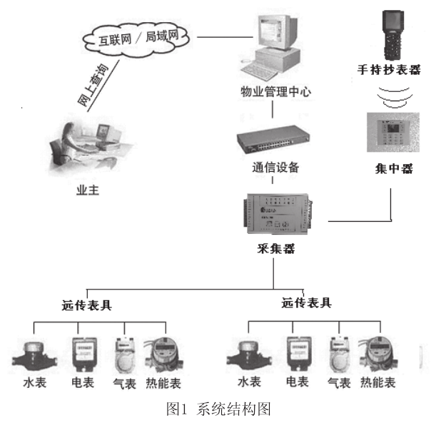 多表遠(yuǎn)程抄收與控制系統(tǒng)由三部分組成,即前端的表具,中間的采集器、中繼器等,終端的轉(zhuǎn)換器、計(jì)算機(jī)、打印機(jī)部分組成。多表遠(yuǎn)程抄收系統(tǒng)前端的冷水表、熱水表、中水表、純凈水表、電表、氣表、熱能表等需為具有輸出功能的遠(yuǎn)傳表具。