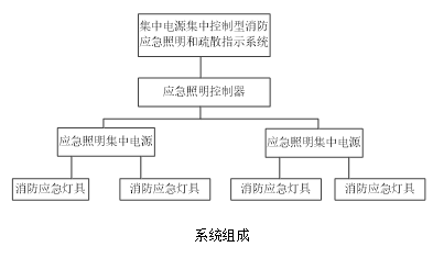 消防應急照明和疏散指示系統(tǒng)由主機(主機)、集中電源(供電)和燈具(疏散指示燈、應急照明燈)等幾部分組成。如下圖: