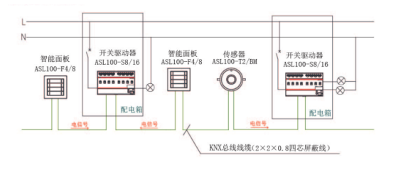 Acrel-BUS智能照明控制系統(tǒng)采用標(biāo)準(zhǔn)的2*2*0.8EIB BUS總線(即KNX總線)作為總線線纜,將所有的智能照明控制模塊連接到一起并組成一套完整的控制系統(tǒng),既可實現(xiàn)照明燈具的遠(yuǎn)程集中控制,又可實現(xiàn)就近控制功能。該系統(tǒng)理論可連接控制模塊數(shù)量達(dá)580000多個。