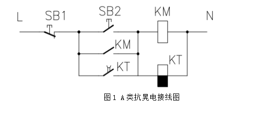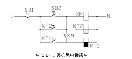 這種抗晃電方式,是目前某化工廠普遍使用的一種方式,使用兩個時間繼電器,其接線方式如圖2所示,當(dāng)電網(wǎng)發(fā)生波動時,接觸器的線圈失電,接觸器的輔助常開接點KM斷開,時間繼電器KT1的輔助常開接點延時斷開。電網(wǎng)恢復(fù)時,通過時間繼電器KT1斷電延時斷開的輔助接點(KT1)接通時間繼電器KT1和KT2的線圈,KT2輔助接點得電延時閉合接通接觸器KM線圈,實現(xiàn)電動機(jī)的自啟動。B類、C類時間分別整定為KT1=4s,KT2=6s;KT1= 4s,KT2=8s。