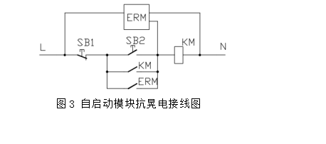 這種抗晃電方式,是某化工廠部分配電室原有的帶自啟動模塊(ERM)的一種接線方式,與一種單時間繼電器方式差不多,如圖3所示,當(dāng)電網(wǎng)發(fā)生波動時4s鐘之內(nèi)恢復(fù)供電(4s鐘固定不可調(diào)),自啟動模塊的節(jié)點延時閉合,啟動電動機(jī),4s以后來電就不再啟動電動機(jī)。自啟動模塊(ERM)自開工至今已經(jīng)使用十幾年了,由于原來的自啟動模塊(ERM)原件已老化,不能準(zhǔn)確動作,新模塊又采購不到,所以,這種模式已基本被淘汰。