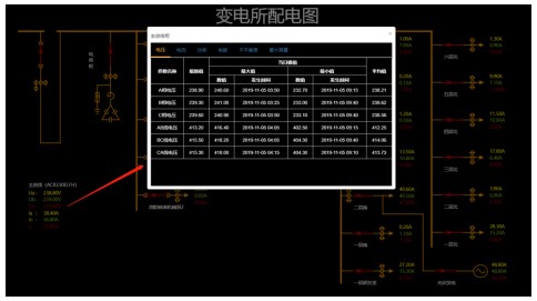 通過矢量配電圖監(jiān)測變電所用電情況,畫面響應(yīng)遙信變位、遙測越限報(bào)警,點(diǎn)擊某個配電回路后可以查詢該配電回路的各類詳細(xì)用電參數(shù),包括實(shí)時值、平均值;