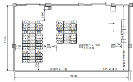 某煤礦模塊化數(shù)據(jù)中心的平面配置如圖 1 所示,某煤礦數(shù)據(jù)中心實(shí)景如圖 2 所示。 某煤礦數(shù)據(jù)中心共采購(gòu)兩組 IDS 2000 雙 排模塊化數(shù)據(jù)中心,西側(cè)模塊數(shù)據(jù)中心包含一體化配電柜、行間空調(diào)、UPS 電源、雙回路電源輸入柜、UPS 電源輸出柜、空調(diào)電源柜,東側(cè)模塊數(shù)據(jù)中心包括配電柜、行間空調(diào)、中控、監(jiān)控和 ODF 配線柜,其中還在數(shù)據(jù)中心機(jī)房預(yù)留有擴(kuò)容區(qū)域。