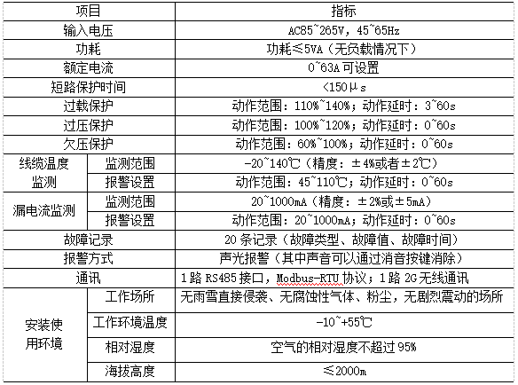 產(chǎn)品具有短路保護、過載保護、表內(nèi)超溫保護、過欠壓保護、配電線纜溫度監(jiān)測、漏電流監(jiān)測功能、通訊等功能。