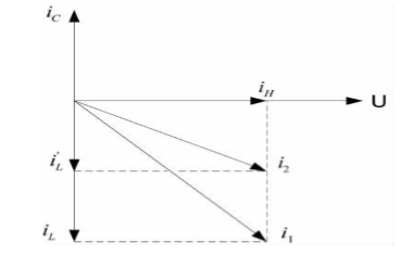 根據(jù)電路原理,電流在電感元件中作功時,電流滯后于電壓90o。而電流在電容元件中作功時,電壓滯后于電流90o。在同一電路中,電感電流與電容電流方向相反,互差180o,兩者的電流相互抵消,使電流的矢量與電壓矢量之間的夾角縮小。感性負荷的有功電流IH與電壓U同相位,假設電感和電容的合成電流為I1,無功功率為Q1,功率因數(shù)cosφ1,各相量的相位關系如下圖。