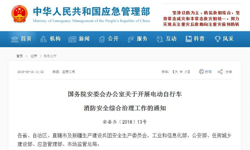 2018515日國(guó)務(wù)院發(fā)布《國(guó)務(wù)院安委會(huì)辦公室關(guān)于開展電動(dòng)自行車消防安全綜合治理工作的通知》開展電動(dòng)自行車消防安全綜合治理工作。