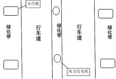 風(fēng)能、光伏發(fā)電系統(tǒng)是整個設(shè)計重要組成部分,主要經(jīng)過風(fēng)力發(fā)電機、光伏發(fā)電板組發(fā)電通過充電裝置穩(wěn)壓、限流后儲存在高速服務(wù)去的蓄電站中。風(fēng)力發(fā)電機和光伏發(fā)電板組的分布示意圖如圖1所示,高速公路兩行車道之間綠化帶中安置垂直軸風(fēng)力發(fā)電機,其中安置密度需對高速周圍空間、風(fēng)能儲備情況、車流量等進(jìn)行數(shù)據(jù)分析來確定風(fēng)力發(fā)電機的安裝密度。根據(jù)行車的高度限制、風(fēng)力大小來確定安裝風(fēng)機的高度及使用風(fēng)機的規(guī)格、大小。行車道兩側(cè)可安置光伏發(fā)電板,根據(jù)植被的生長需要,選擇光伏板發(fā)電板的規(guī)格及安裝高度、密度。