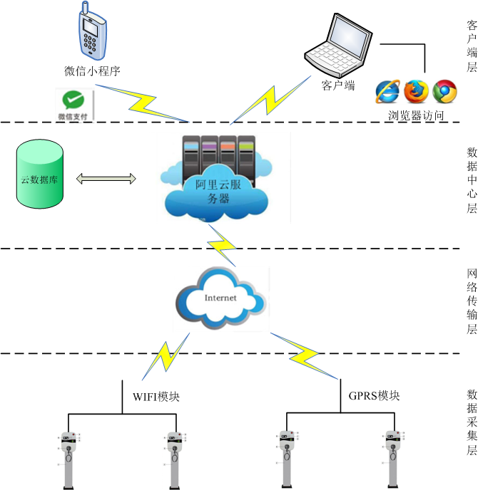 安科瑞Acrelcloud-充電樁收費運營云平臺系統(tǒng)通過物聯(lián)網(wǎng)技術(shù)對接入系統(tǒng)的充電樁站點和各個充電樁進(jìn)行不間斷地數(shù)據(jù)采集和監(jiān)控,同時對各類故障如充電機過溫保護(hù)、充電機輸入輸出過壓、欠壓、絕緣檢測故障等一系列故障進(jìn)行預(yù)警;用戶通過微信小程序掃描二維碼,進(jìn)行支付后,系統(tǒng)發(fā)起充電請求,控制二維碼對應(yīng)的充電樁完成電動汽車的充電過程。