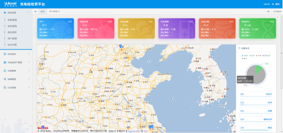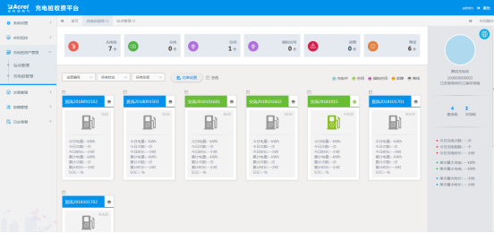 充電站監(jiān)控頁面監(jiān)視用戶充電槍總數(shù)、正在充電的槍數(shù)、空閑槍數(shù)、插槍數(shù)量、故障槍數(shù)量等,匯總了用戶擁有各樁的當(dāng)日充電總次數(shù)、總電量、總時長,進(jìn)行負(fù)荷限制、故障查詢。