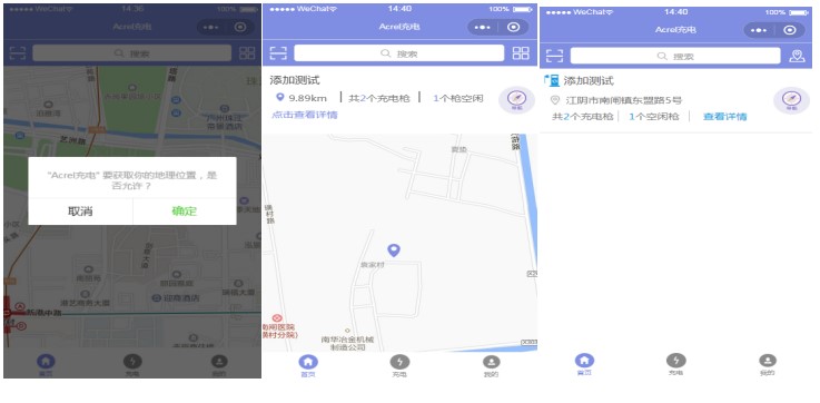 初次進(jìn)入主功能頁時需要授權(quán)定位才可以使用地圖相關(guān)功能,在地圖上查看到當(dāng)前所在區(qū)域的充電站,查看充電站信息,可以進(jìn)行掃碼充電操作,地圖導(dǎo)航等。
