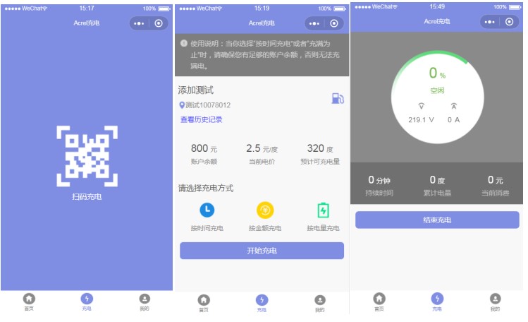 掃描充電槍上的二維碼,如果當(dāng)前充電樁可用即可進(jìn)入充電選擇頁面,可以查看到當(dāng)前的充電站名稱、充電槍名稱,以及當(dāng)前的賬戶余額,電價和預(yù)計可充電量等數(shù)據(jù),還可以查看當(dāng)前賬戶的歷史充電記錄。充電方式分為按時間充電、按金額充電、按電量充電這三種方式。充電結(jié)束可以進(jìn)進(jìn)行評價。