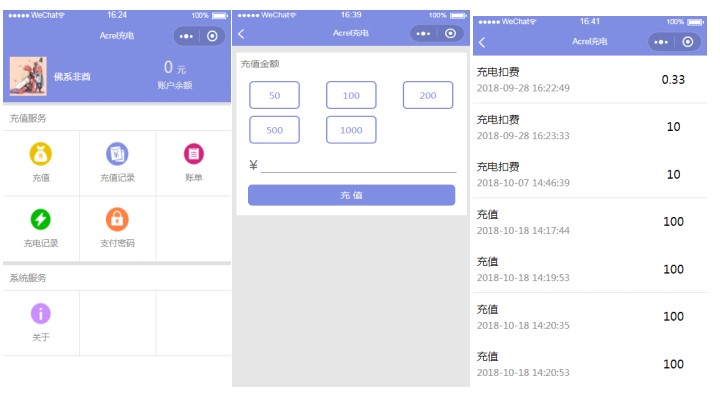 個人信息可以顯示當(dāng)前登錄賬號的昵稱和余額,同時包括、充值、充值記錄查詢、賬單查詢、充電記錄查詢、設(shè)置支付密碼等功能