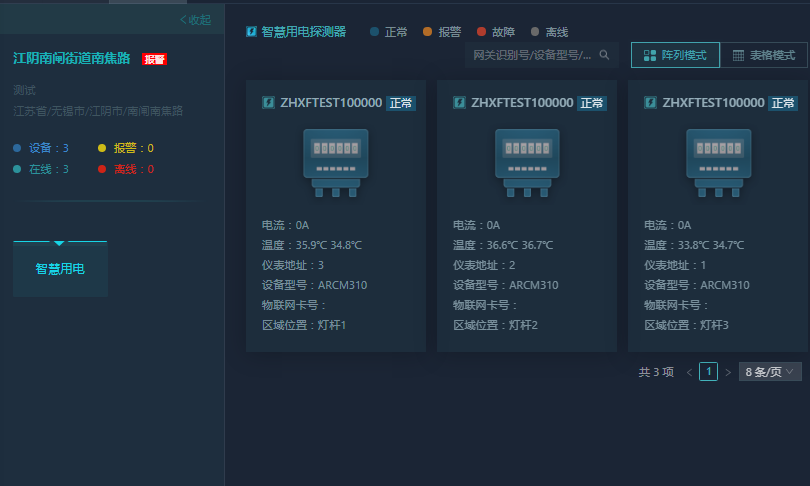 2.監(jiān)測(cè)路燈的電流電壓工作狀態(tài),可以分級(jí)設(shè)置預(yù)警值和報(bào)警值,當(dāng)超出閾值范圍時(shí)進(jìn)行預(yù)警和報(bào)警,
