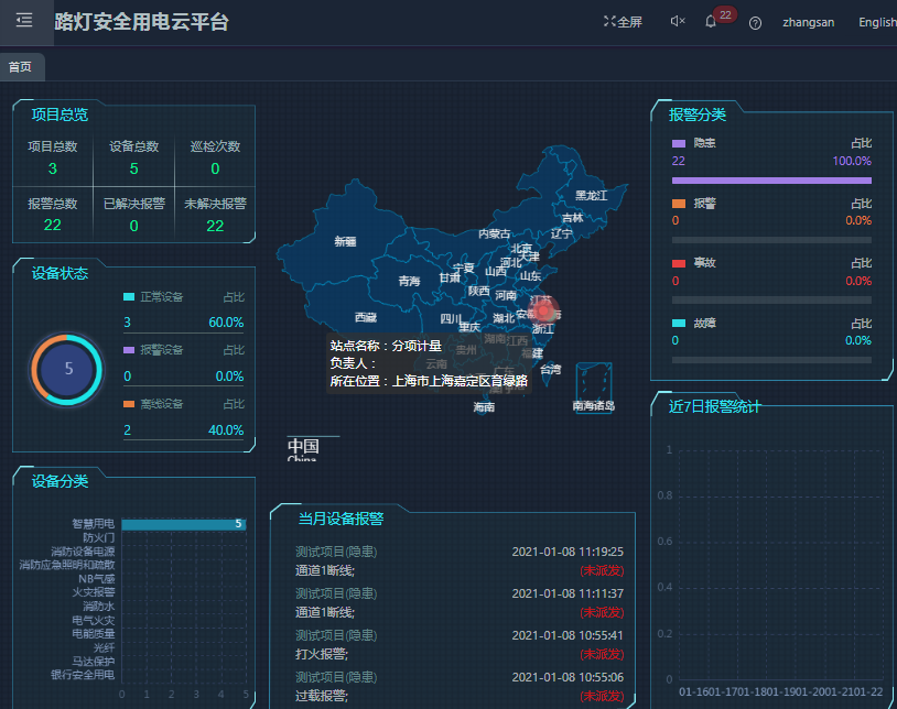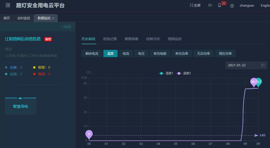 5.對(duì)路燈回路的漏電流和導(dǎo)線溫度進(jìn)行監(jiān)測(cè),如果漏電過(guò)大,線纜溫度過(guò)高則進(jìn)行預(yù)警或報(bào)警;