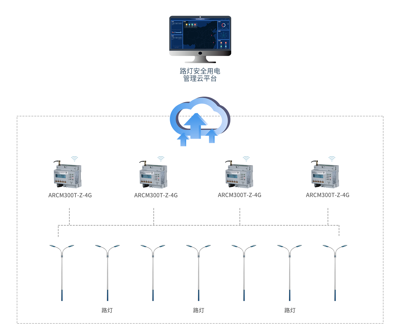 直接接入ARCM310儀表,監(jiān)控每個(gè)路燈的電壓、電流等電參量進(jìn)行預(yù)警和報(bào)警,也可設(shè)置定時(shí)通斷時(shí)間并遠(yuǎn)程控制路燈通斷
