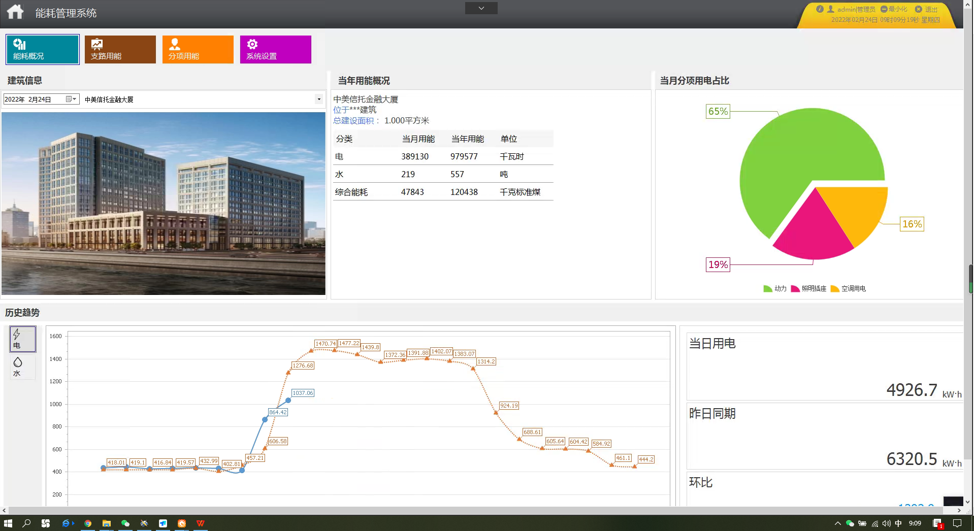 Acrel-5000能耗管理系統(tǒng)登陸成功進(jìn)入主頁(yè)面,主頁(yè)面顯示該建筑的建筑圖片,建筑基本信息,建筑當(dāng)月分項(xiàng)用電餅圖和各種能源的消耗量。根據(jù)所選的建筑,對(duì)其建筑圖片進(jìn)行加載,可以選擇時(shí)間查看建筑能耗情況,選擇建筑或時(shí)間后自動(dòng)刷新,默認(rèn)為當(dāng)天。