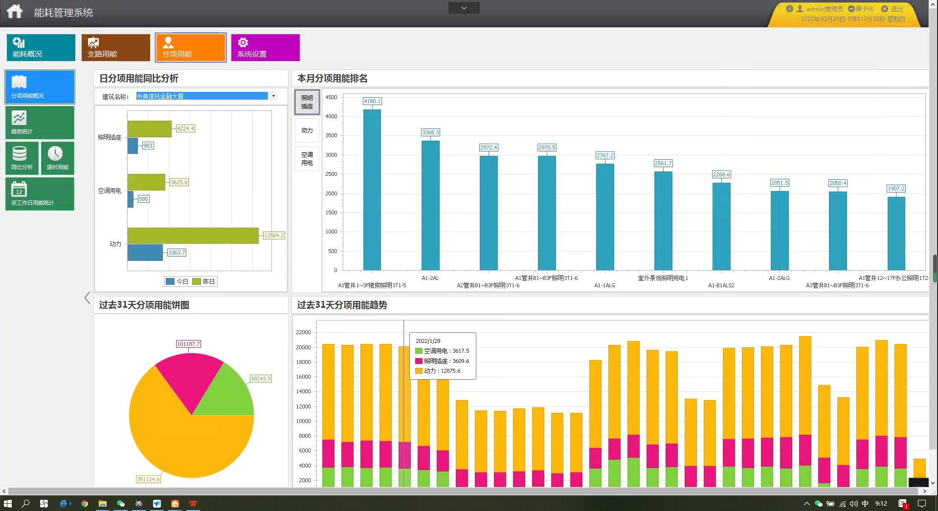 Acrel-5000能耗管理系統(tǒng)可以按照分項(xiàng)進(jìn)行能耗統(tǒng)計(jì)與顯示。其中,日分項(xiàng)用能同比分析圖顯示不同分項(xiàng)的當(dāng)日與昨日能耗柱狀圖(藍(lán)色柱表示今日,綠色柱表示昨日);用能餅圖顯示各分項(xiàng)過(guò)去31天的用能占比;堆積圖顯示各分項(xiàng)過(guò)去31天的能耗趨勢(shì);分項(xiàng)用能排名圖顯示被選中分項(xiàng)對(duì)應(yīng)能耗值排名前10位的支路。