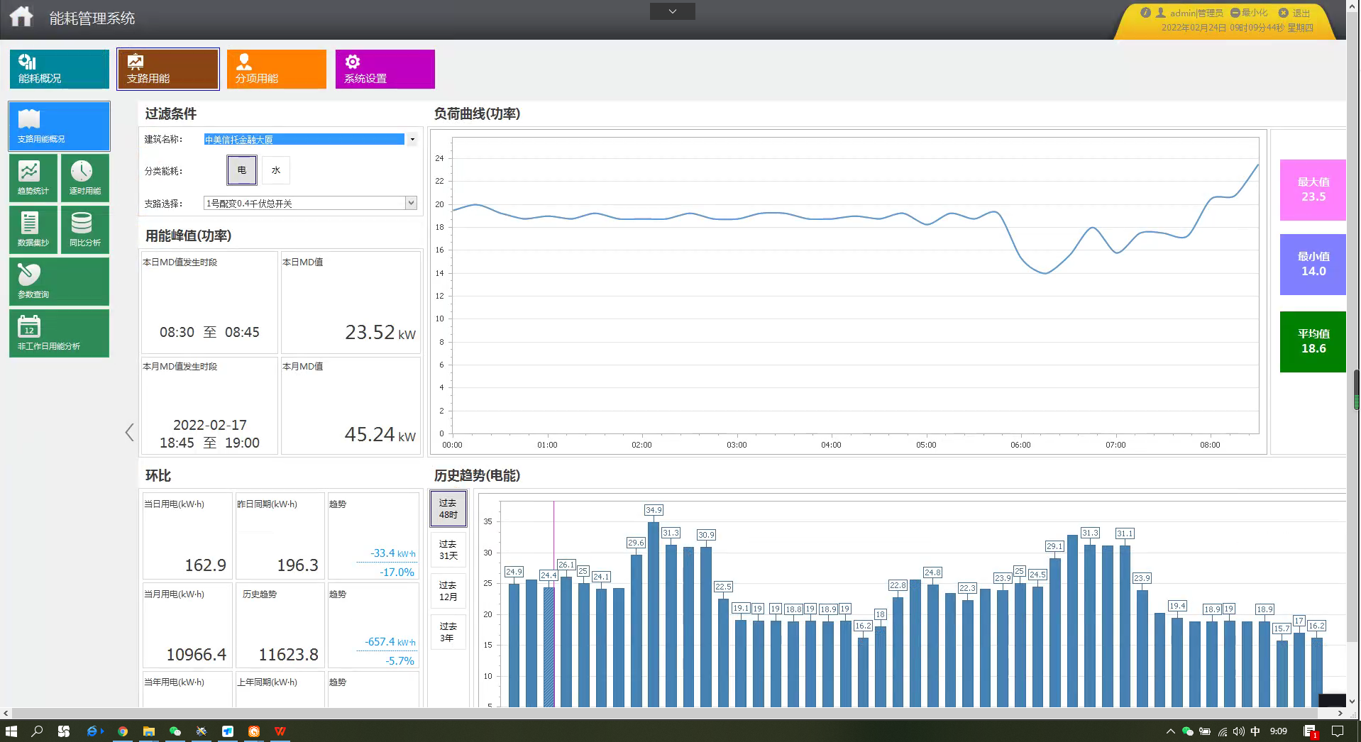 Acrel-5000能耗管理系統(tǒng)可以根據(jù)分類能耗的支路名稱查詢用能情況,顯示當(dāng)日和當(dāng)月的用能峰值(電能對(duì)應(yīng)Z大需量值)、當(dāng)日用能、當(dāng)月用能、當(dāng)年用能以及昨天同期用能、上月同期用能、上年同期用能的比較情況;以柱狀圖顯示過(guò)去48小時(shí)、31天、12個(gè)月、3年的能耗情況;以曲線圖顯示15分鐘的負(fù)荷用能走勢(shì)(電表顯示功率曲線,流量表顯示流速曲線),并顯示當(dāng)前值、15分鐘內(nèi)的Z大值和Z小值。