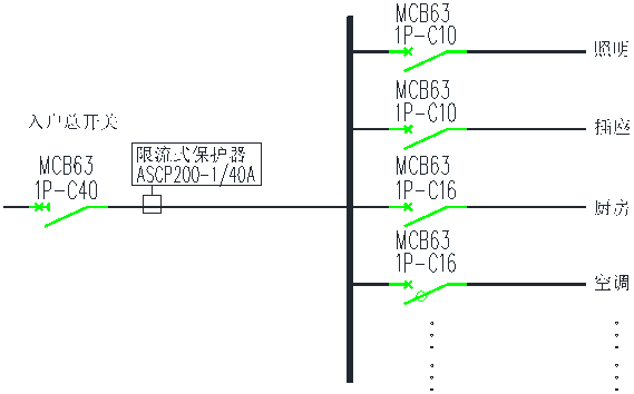ASCP200-1型電氣防火限流式保護(hù)器建議安裝在入戶開關(guān)下端,額定電流值根據(jù)入戶開關(guān)的具體規(guī)格進(jìn)行設(shè)置,典型應(yīng)用示意圖如圖3所示: