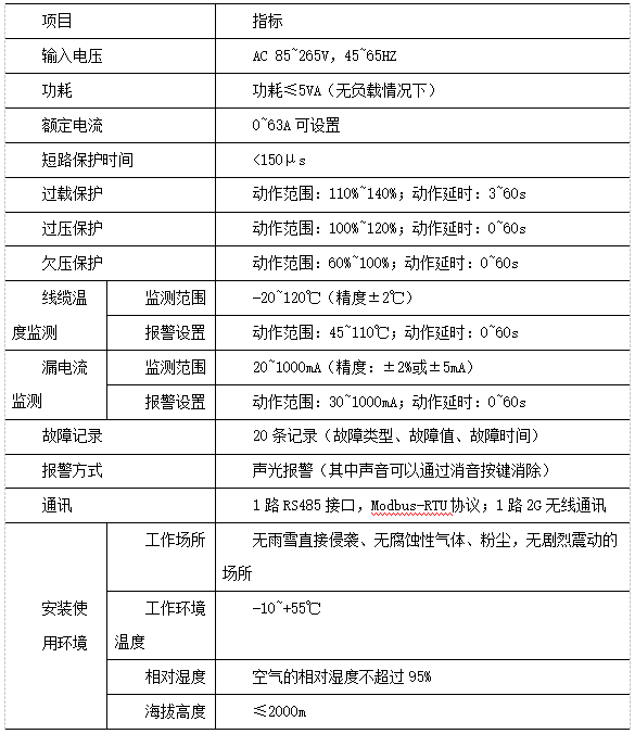 E)電纜溫度監(jiān)測(cè)功能,被測(cè)線纜溫度超過(guò)報(bào)警設(shè)定值時(shí),保護(hù)器告警或限流保護(hù)(可設(shè));