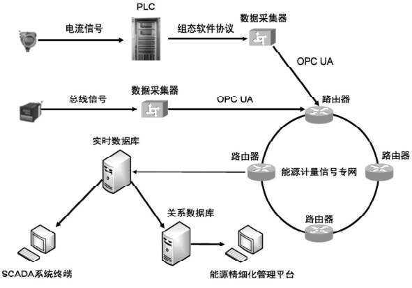 為實(shí)現(xiàn)底層儀表數(shù)據(jù)的穩(wěn)定以及快速傳輸,現(xiàn)場(chǎng)設(shè)置的是MOXA數(shù)據(jù)采集器,將現(xiàn)場(chǎng)的儀表信號(hào)統(tǒng)一以O(shè)PCUA協(xié)議傳輸至能源計(jì)量信號(hào)專網(wǎng)。