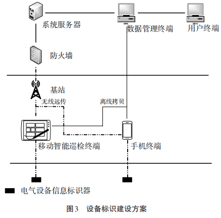 閱讀器兼容各頻段的電子信息標(biāo)識(shí)器,當(dāng)電子信息標(biāo)識(shí)器進(jìn)入閱讀器發(fā)射的射頻場(chǎng)后,其憑借感應(yīng)電流所獲得的能量發(fā)送出存儲(chǔ)在電子信息標(biāo)識(shí)器內(nèi)部的電網(wǎng)設(shè)備相關(guān)信息。由于RFID技術(shù)具備穿透性,所以閱讀器可實(shí)現(xiàn)對(duì)電子信息標(biāo)識(shí)器的穿透讀取。閱讀器可采用移動(dòng)智能巡檢終端或者帶有NFC(Near Field Communication)近場(chǎng)通信功能的手機(jī)等形式[3]。設(shè)備標(biāo)識(shí)建設(shè)方案如圖3所示。