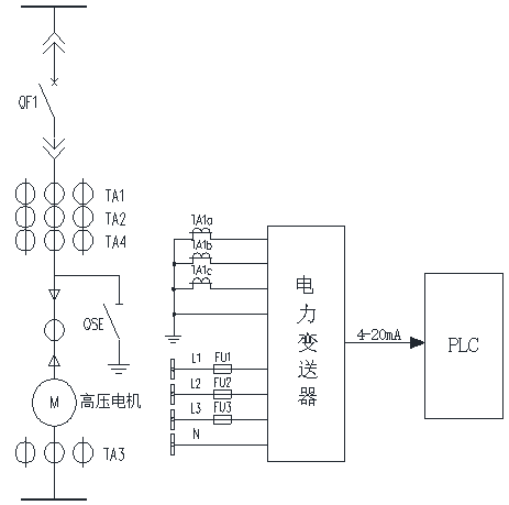 磨漿機10kV高壓系統(tǒng)電路圖如圖2所示。功率變送器通過裝在磨漿機10kV高壓電機線路中的電壓互感器和電流互感器,采集電壓和電流,從而檢測磨漿機10kV高壓電機的功率,功率變送器以4mA表示功率信號的零點,用20mA表示功率信號的滿刻度,然后將功率信號以DC4-20mA成比例關(guān)系線性輸出,傳至PLC。PLC根據(jù)功率信號動態(tài)地調(diào)節(jié)磨漿機的刀距,控制進刀或退刀,從而實現(xiàn)恒功率打漿控制。