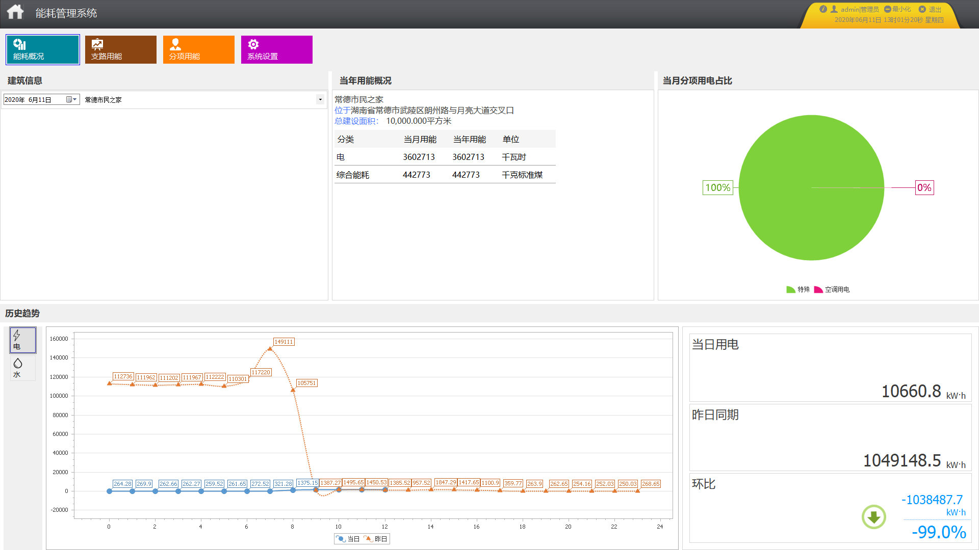 主頁面顯示該建筑的建筑圖片,建筑基本信息,建筑當月分項用電餅圖和各種能源的消耗量。根據(jù)所選的建筑,對其建筑圖片進行加載,可以選擇時間查看建筑能耗情況,選擇建筑或時間后自動刷新,默認為當天。