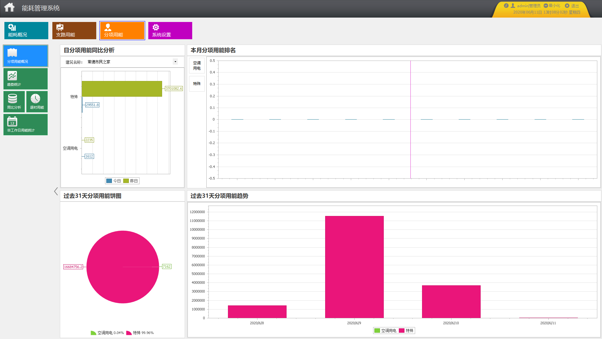 系統(tǒng)可以按照分項進行能耗統(tǒng)計與顯示。其中,日分項用能同比分析圖顯示不同分項的當日與昨日能耗柱狀圖(藍色柱表示今日,綠色柱表示昨日);用能餅圖顯示各分項過去31天的用能占比;堆積圖顯示各分項過去31天的能耗趨勢;分項用能排名圖顯示被選中分項對應(yīng)能耗值排名前10位的支路。