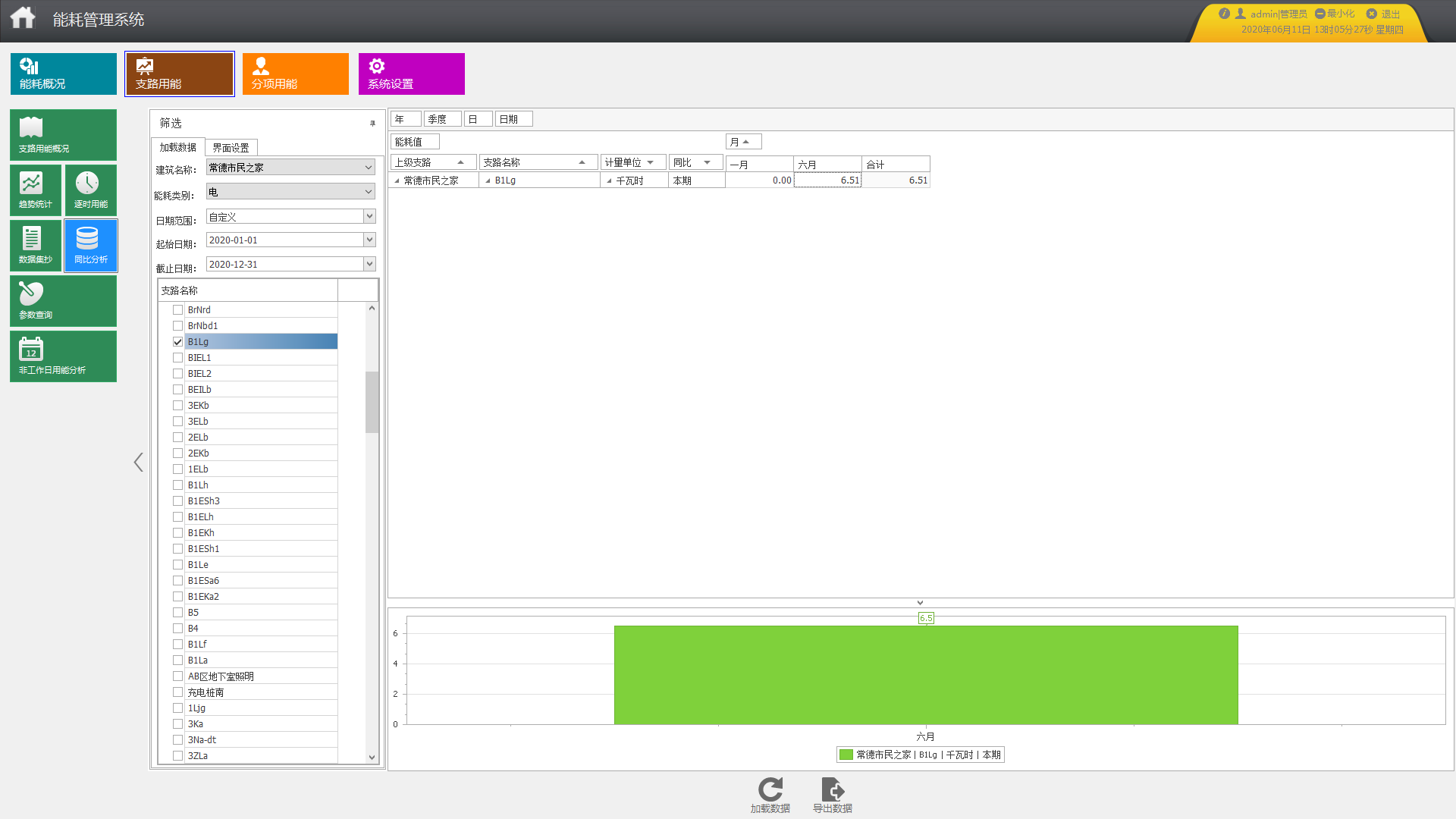 系統(tǒng)可將各主要耗能設(shè)備的能耗與去年同期值和上月值進行同比環(huán)比分析,檢驗節(jié)能效果,根據(jù)分析結(jié)果執(zhí)行節(jié)能績效考核,以及節(jié)能目標的修正。統(tǒng)計各支路當年每月用能及去年同期用能;
