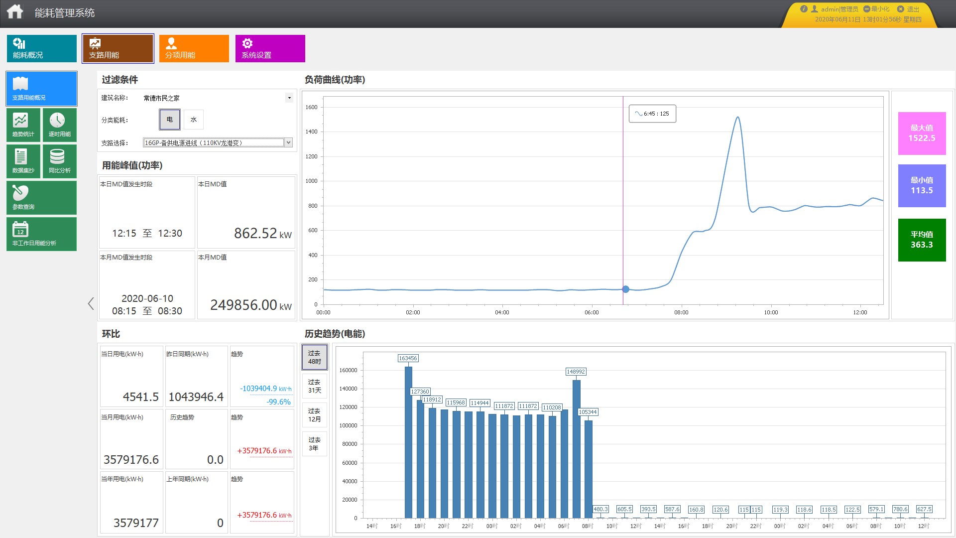 系統(tǒng)可以統(tǒng)計各支路某段時間內(nèi)逐日、逐周、逐月、逐季、逐年用能。系統(tǒng)可查看各支路用能趨勢,可根據(jù)已有的日期或者自定義時間進行查詢,并可以將支路用能顯示合計,以圖表形式顯示。