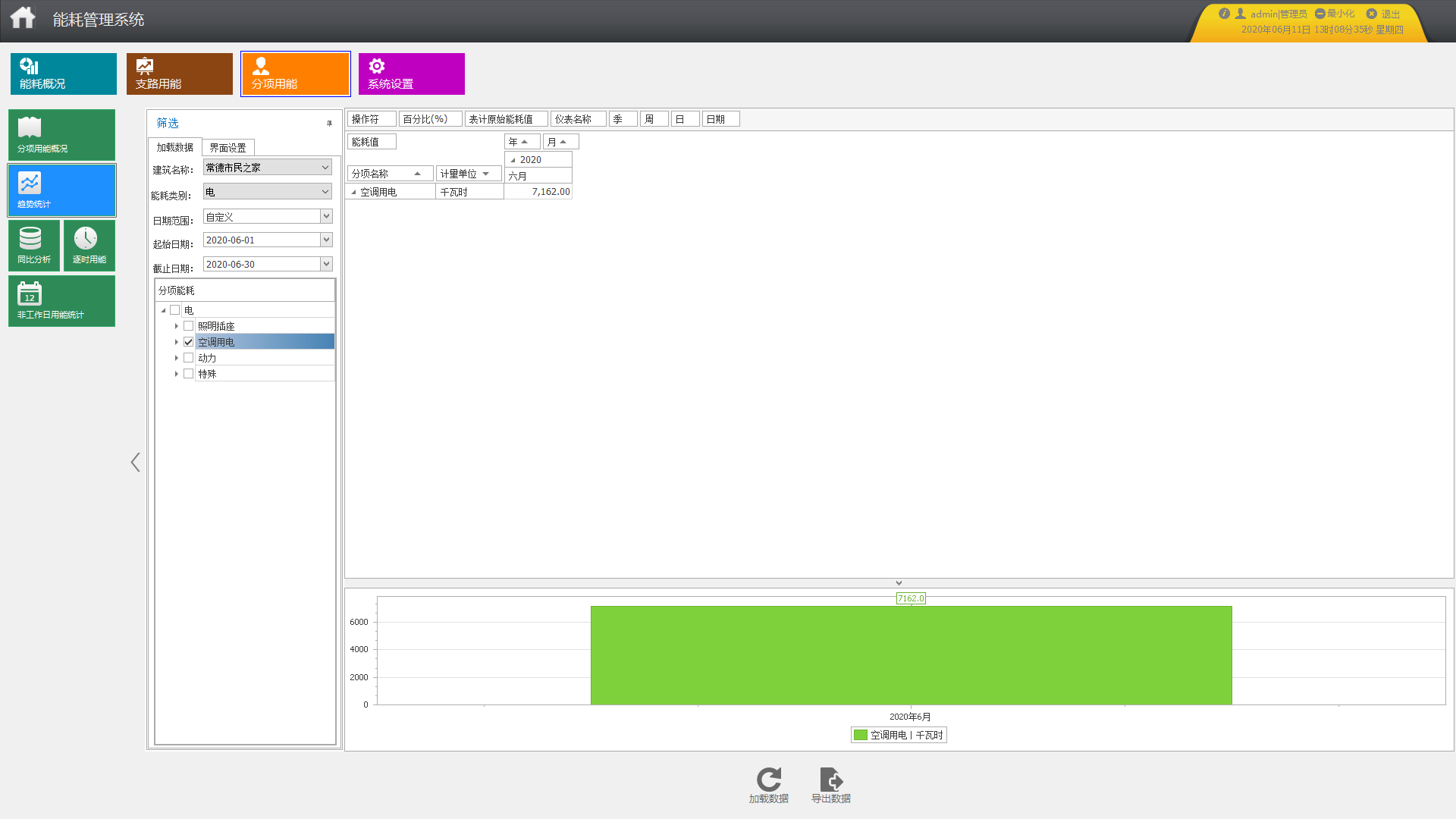 系統(tǒng)可以統(tǒng)計各分項某段時間內(nèi)逐日、逐周、逐月、逐季、逐年用能??刹榭捶猪椫懈髦酚媚苴厔?,可根據(jù)已有的日期或者自定義時間進行查詢,統(tǒng)計數(shù)據(jù)可導(dǎo)出至Excel。