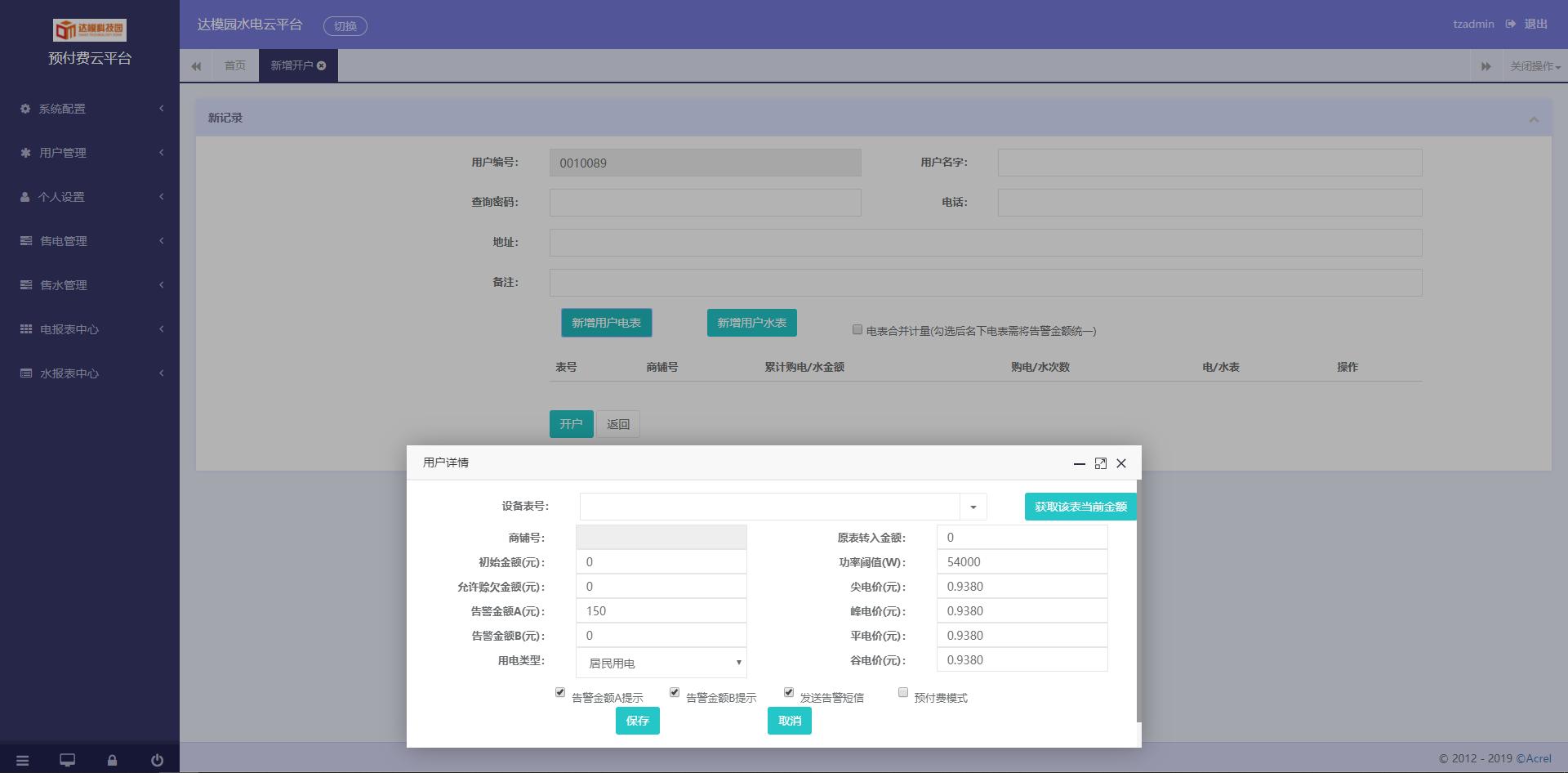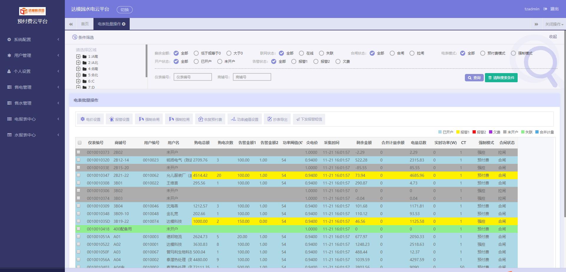 系統(tǒng)針對(duì)商鋪開戶不僅支持一戶一表,也支持一戶掛多表的需要;同時(shí)支持和解決了項(xiàng)目改造后新老表切換時(shí),老表金額轉(zhuǎn)入的問題;支持峰谷電價(jià),支持一表一電價(jià);可對(duì)單表設(shè)置功率過載的閾值,也支持設(shè)置單表金額報(bào)警的兩級(jí)閾值。
