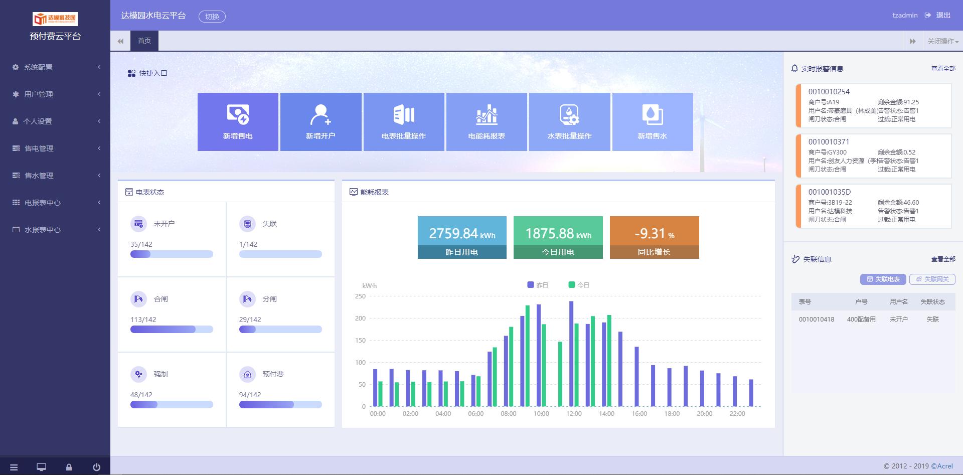 系統(tǒng)登錄首頁(yè),首頁(yè)提供新增售電售水、新增開戶、銷戶等快捷入口,實(shí)時(shí)顯示所有儀表的在線狀態(tài),以柱狀圖的形式展示整個(gè)項(xiàng)目的能耗柱狀圖等功能。