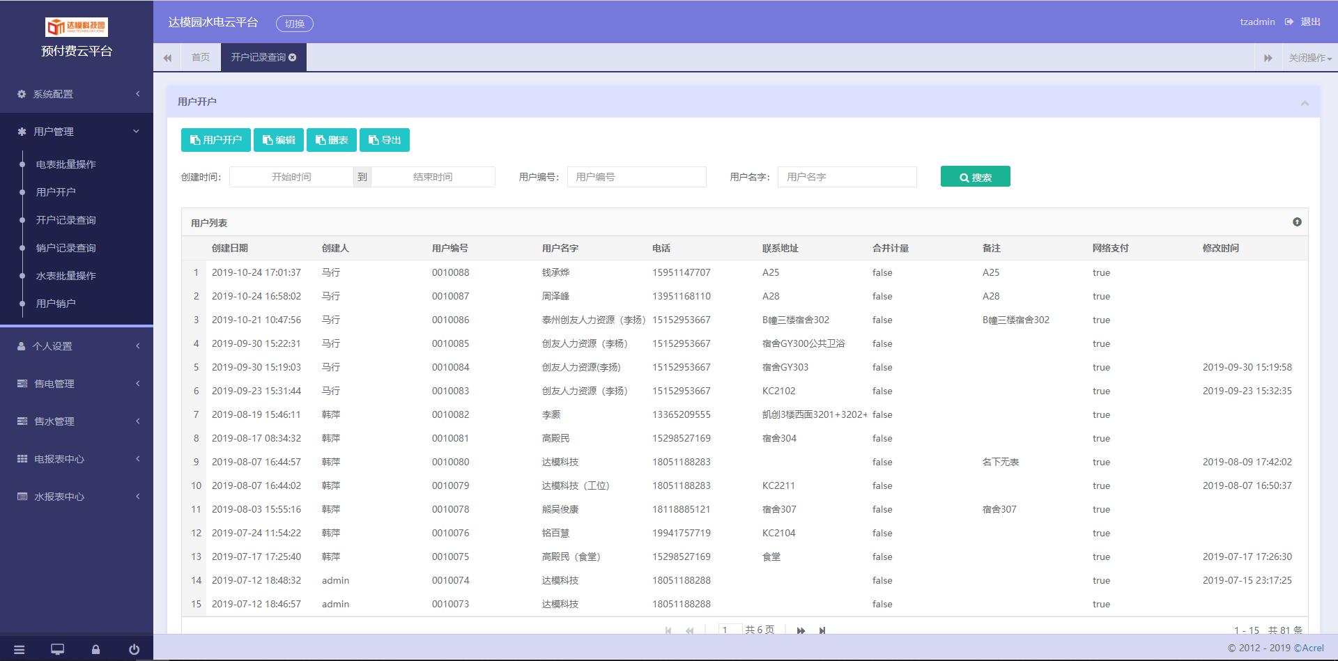 用戶通過網(wǎng)頁(yè)進(jìn)行登錄,系統(tǒng)管理員可以分配各子賬戶及相應(yīng)權(quán)限。查看系統(tǒng)日志等功能;系統(tǒng)設(shè)置:對(duì)建筑、通訊管理機(jī)、儀表及默認(rèn)參數(shù)進(jìn)行配置;用戶管理:對(duì)商鋪用戶執(zhí)行開戶、銷戶、遠(yuǎn)程分合閘、抄表導(dǎo)出及記錄查詢等操作;售電管理:對(duì)已開戶的表進(jìn)行遠(yuǎn)程售電、退電、沖正及記錄查詢等操作;報(bào)表中心:提供售電財(cái)務(wù)報(bào)表、用能報(bào)表、報(bào)警報(bào)表等查詢。